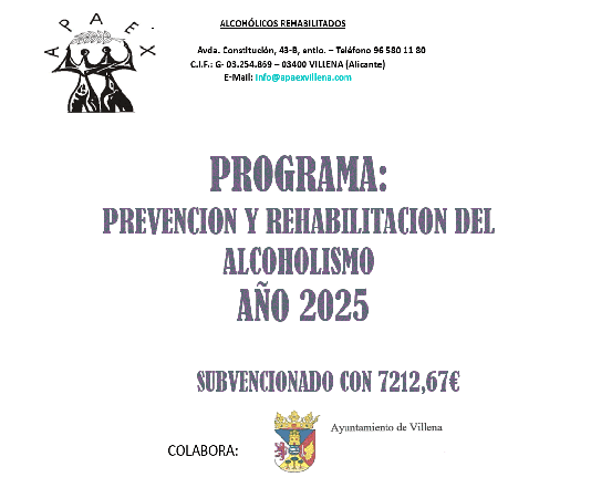 Programa Prevención y Rehabilitación del Alcoholismo año 2025 subvencionado con 7.212,67 Euros por el M.I. Ayuntamiento de Villena.